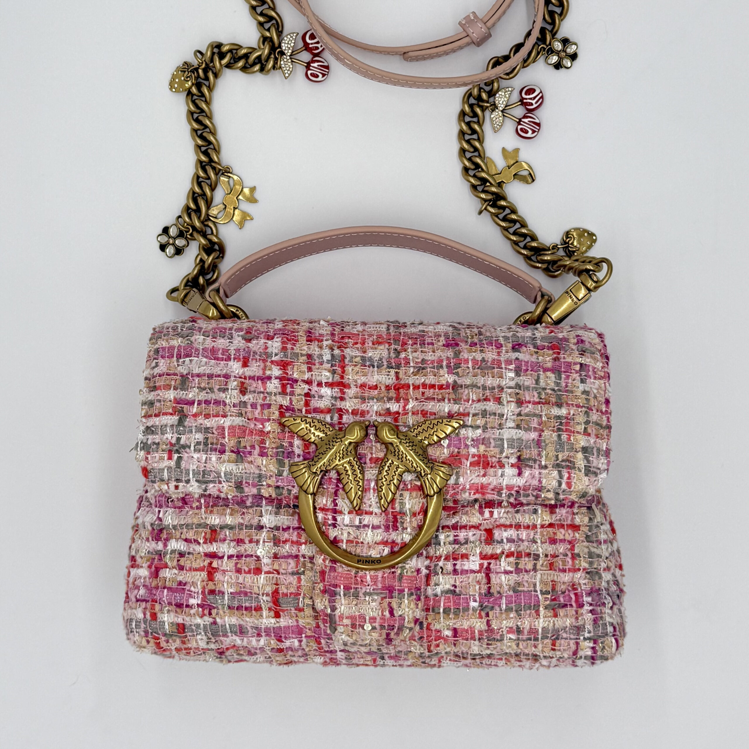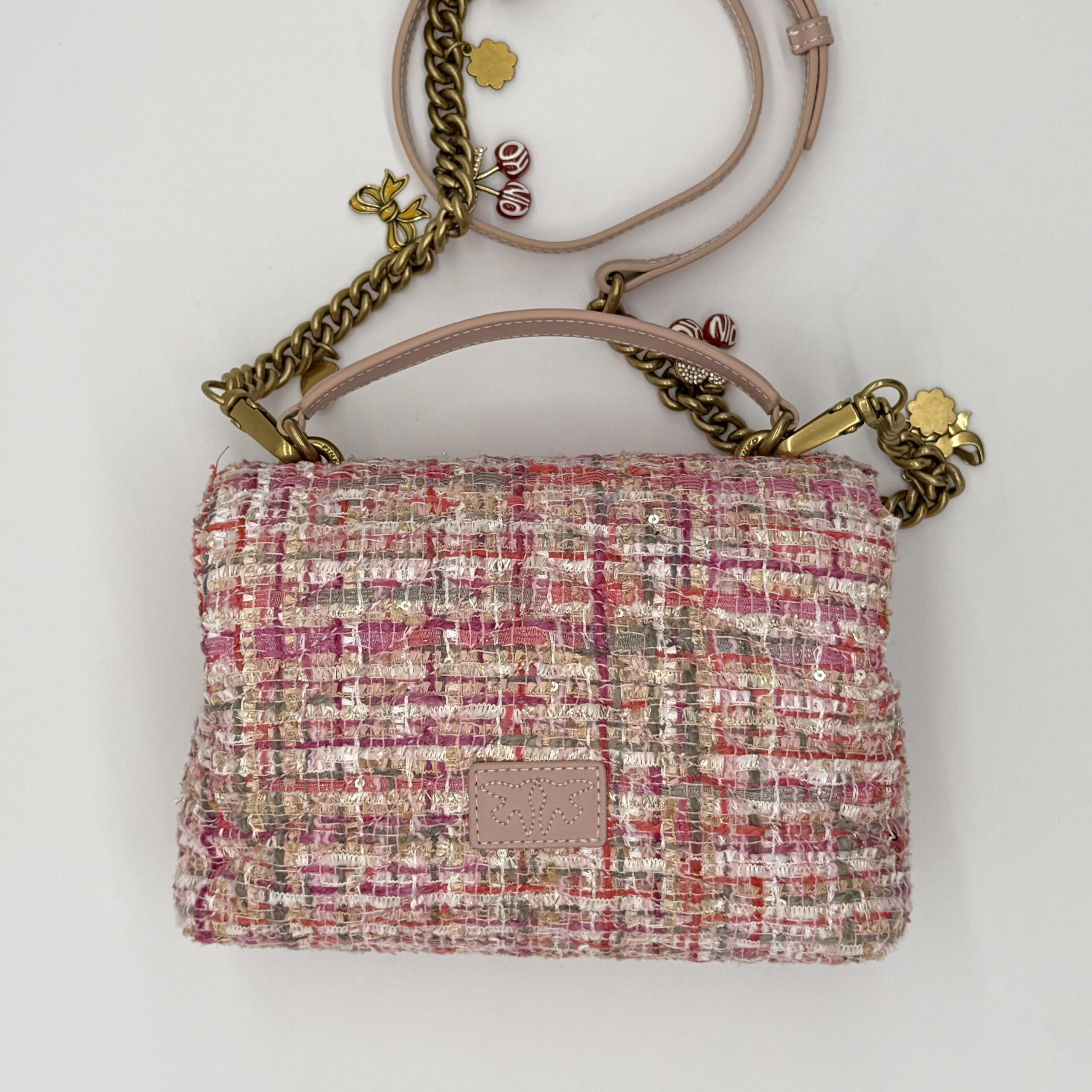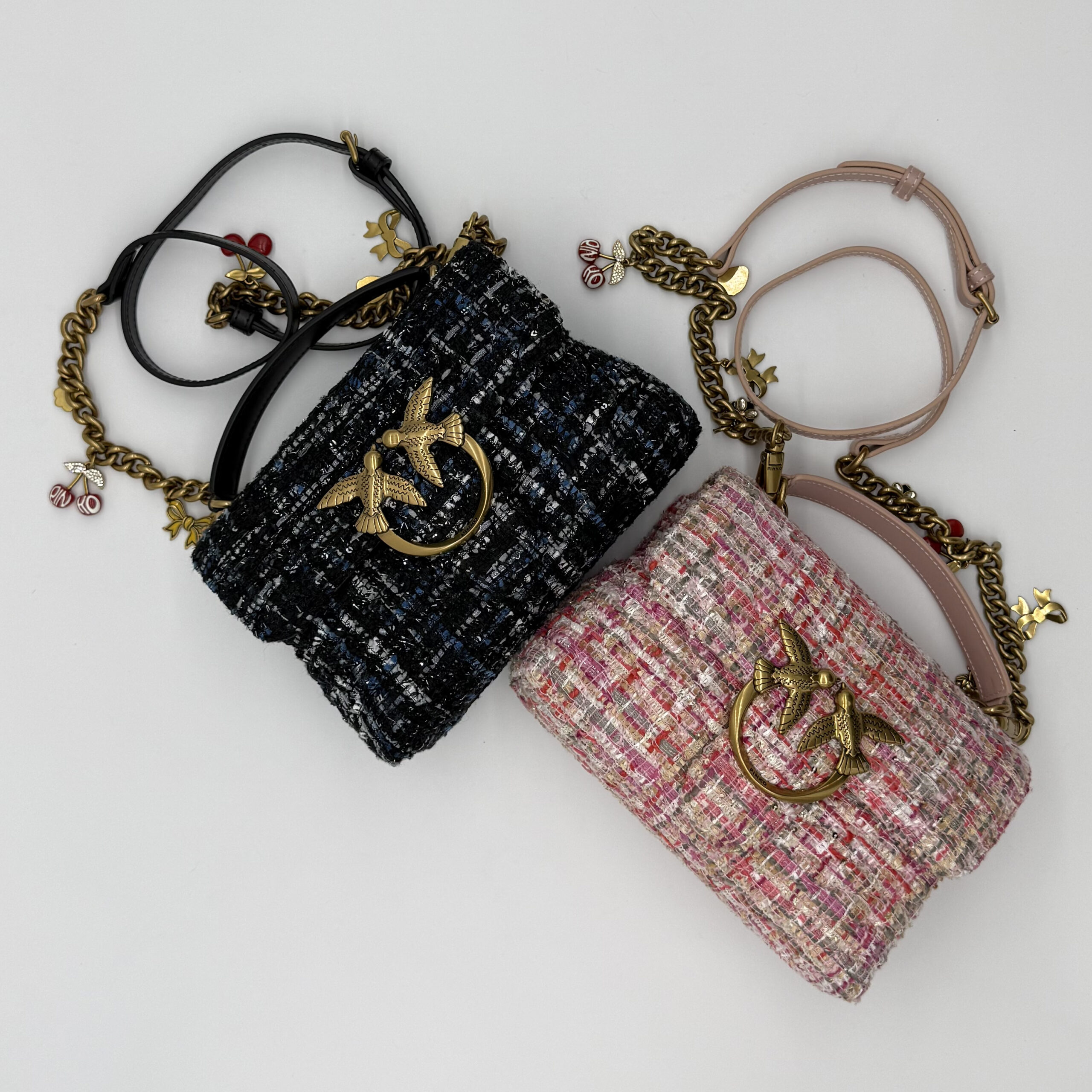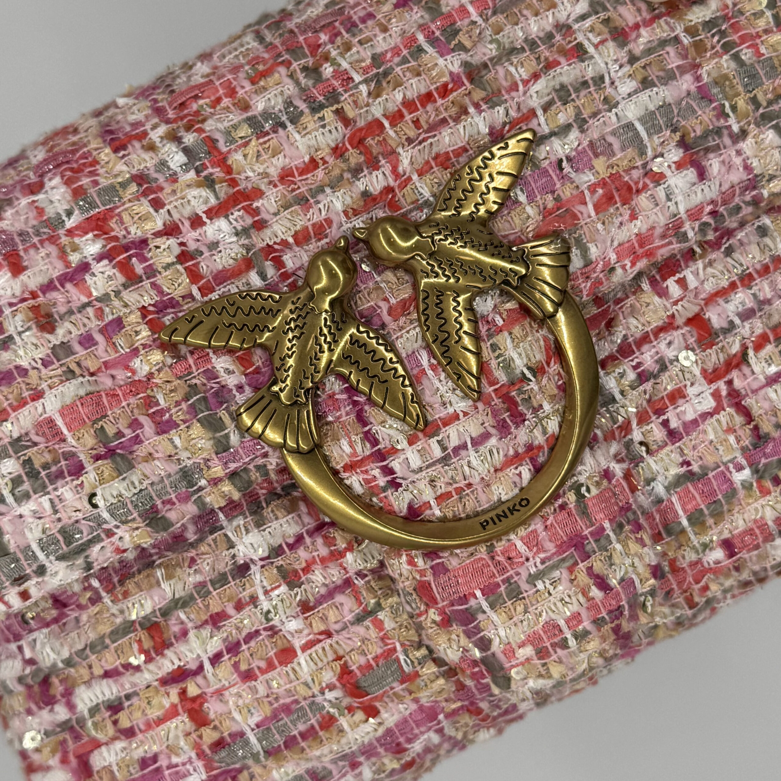 Ova torbica iz kolekcije Love Baby Puff predstavlja sofisticiran spoj luksuznih materijala i prepoznatljivog dizajna brenda Pinko. Model je izrađen u kombinaciji bouclé tkanine sa chevron (cik-cak) uzorkom i fine nappa kože, što torbi daje bogatu teksturu i elegantan, modno upečatljiv izgled.
