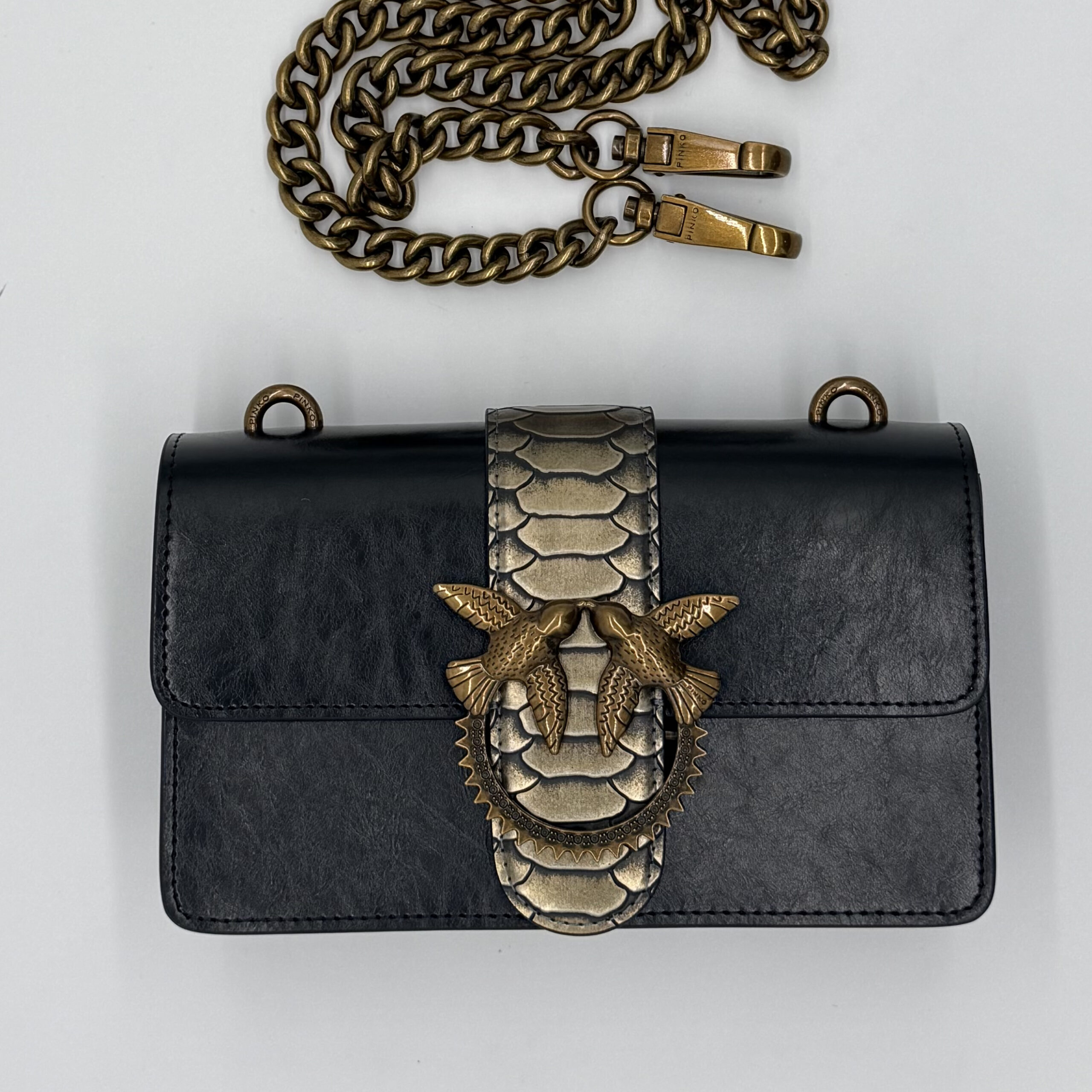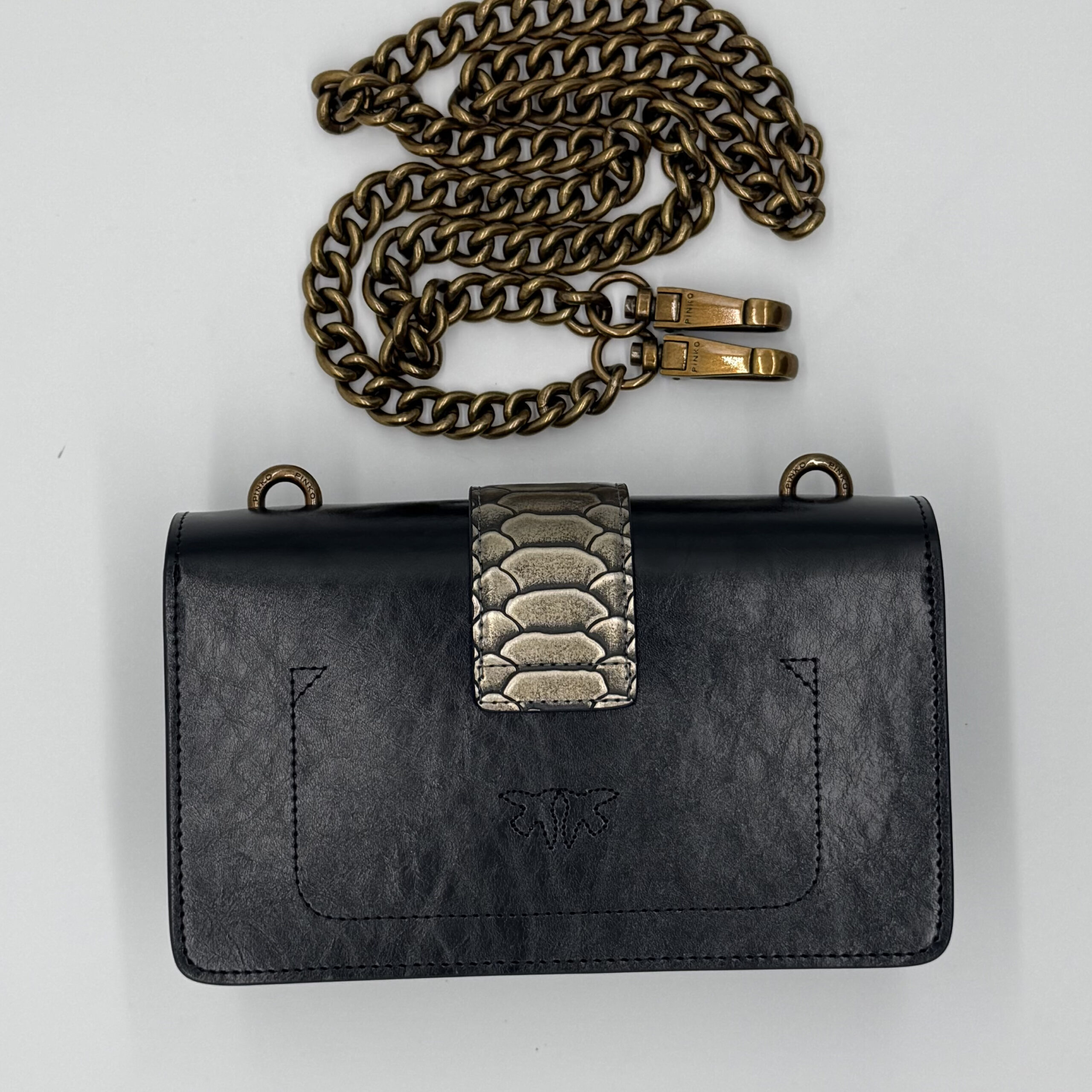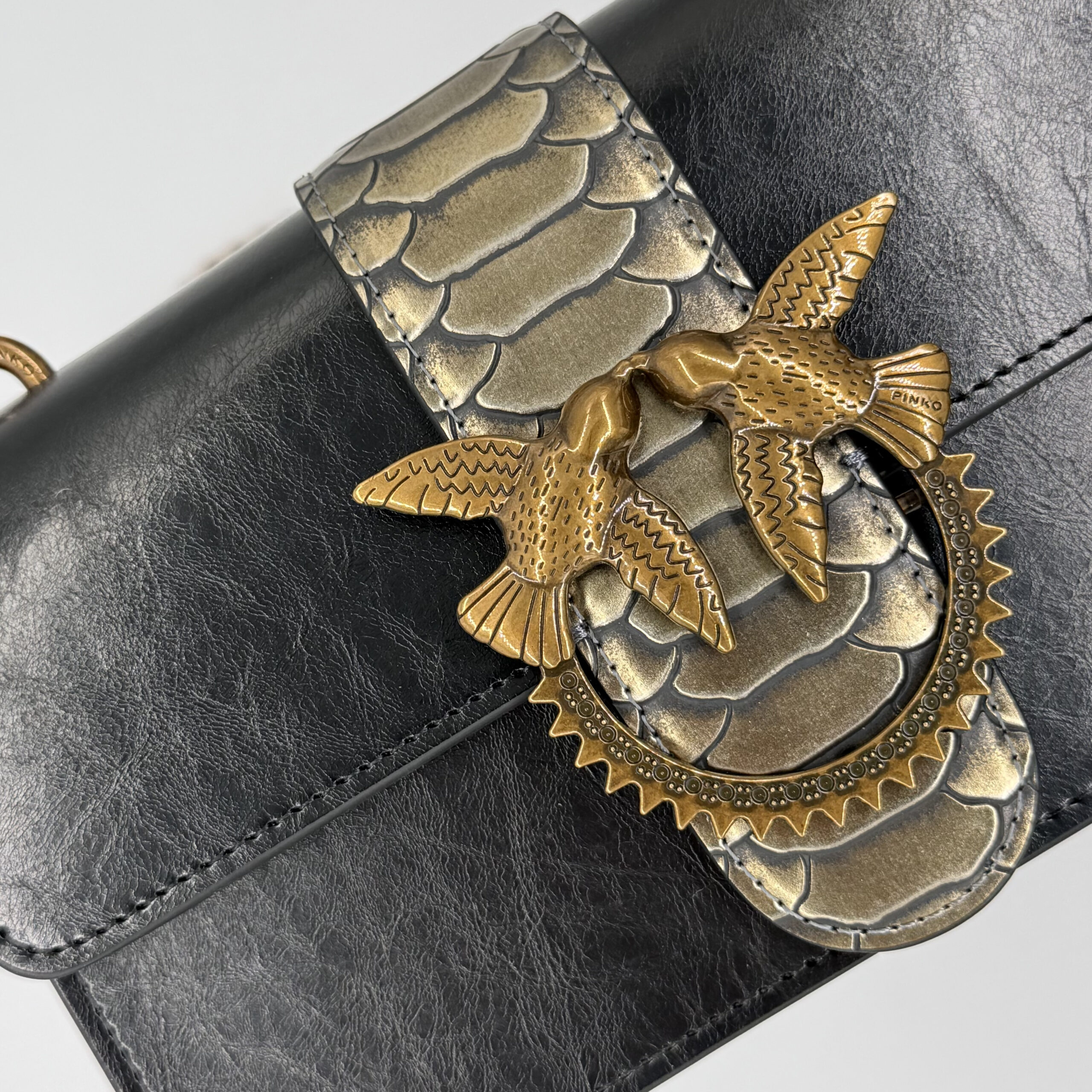 Ova crna torba iz linije Love Mini Python Western Tracol donosi snažan, urban karakter uz prepoznatljivi Pinko luksuz. Izrađena je od vitello vintage kože, obogaćene python (piton) efektom i reljefnim detaljima koji torbi daju izražen i autentičan izgled.