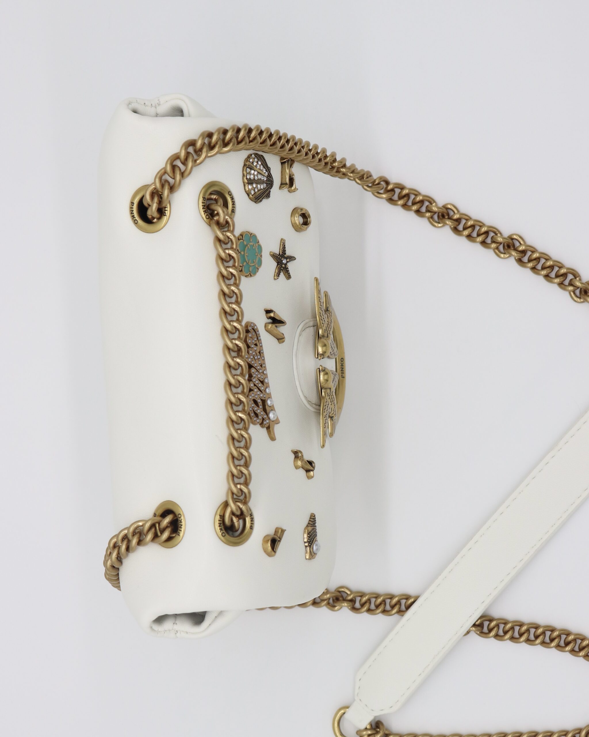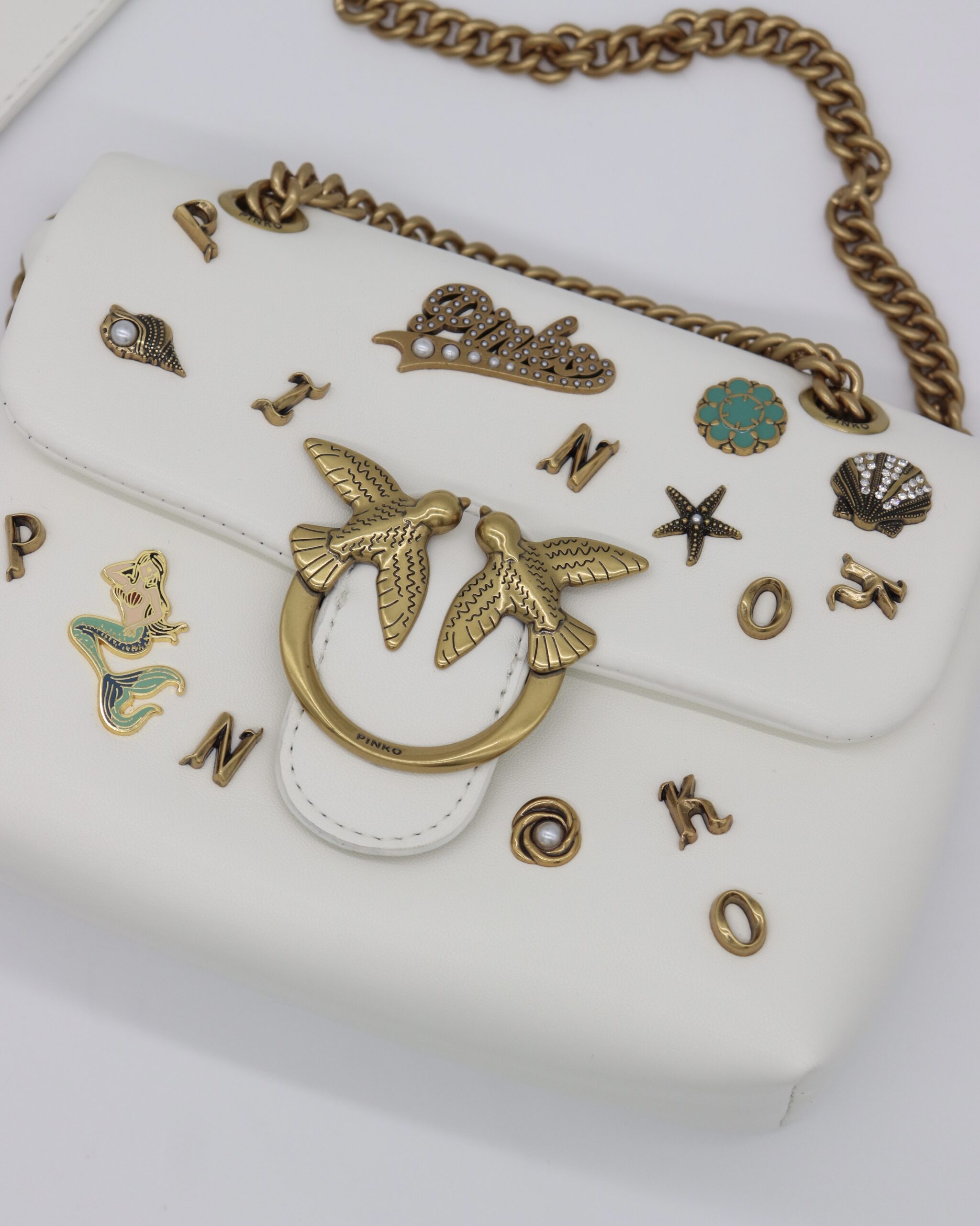Ova specijalna edicija Mini Love torbe pravi je modni dragulj za one koje vole da se ističu! Ukrašena bedževima u obliku školjki, zvezda, bisera, sirena i šarenih simbola, torba nosi poruke vedrine i zabave. Model kombinuje prepoznatljiv Pinko dizajn sa šarmantnim, ručno postavljenim detaljima koji je čine unikatnom. Idealan dodatak za urbane kombinacije sa dozom ličnog stila.