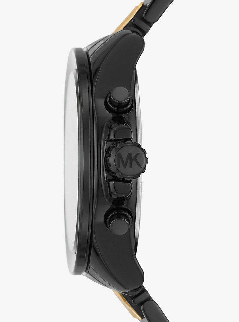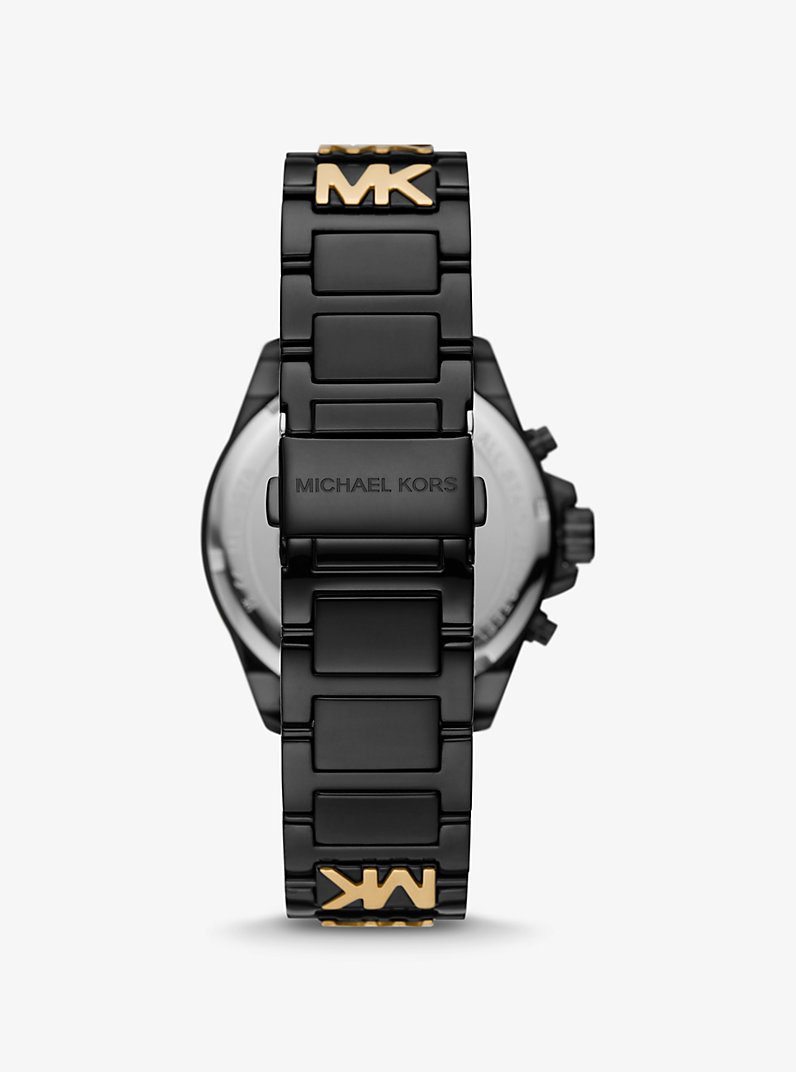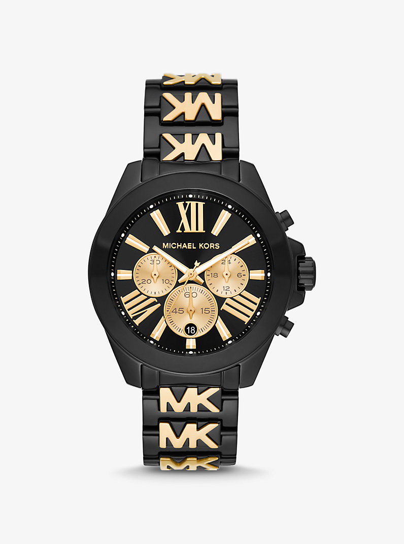 Narukvica je metalna sa crnim i zlatnim dvobojnim završetkom, često sa uzorkom MK logotipa na karikama, što dodatno naglašava premium stil. Kopča sa dvostrukim sigurnosnim zatvaranjem osigurava udobno nošenje kroz ceo dan.