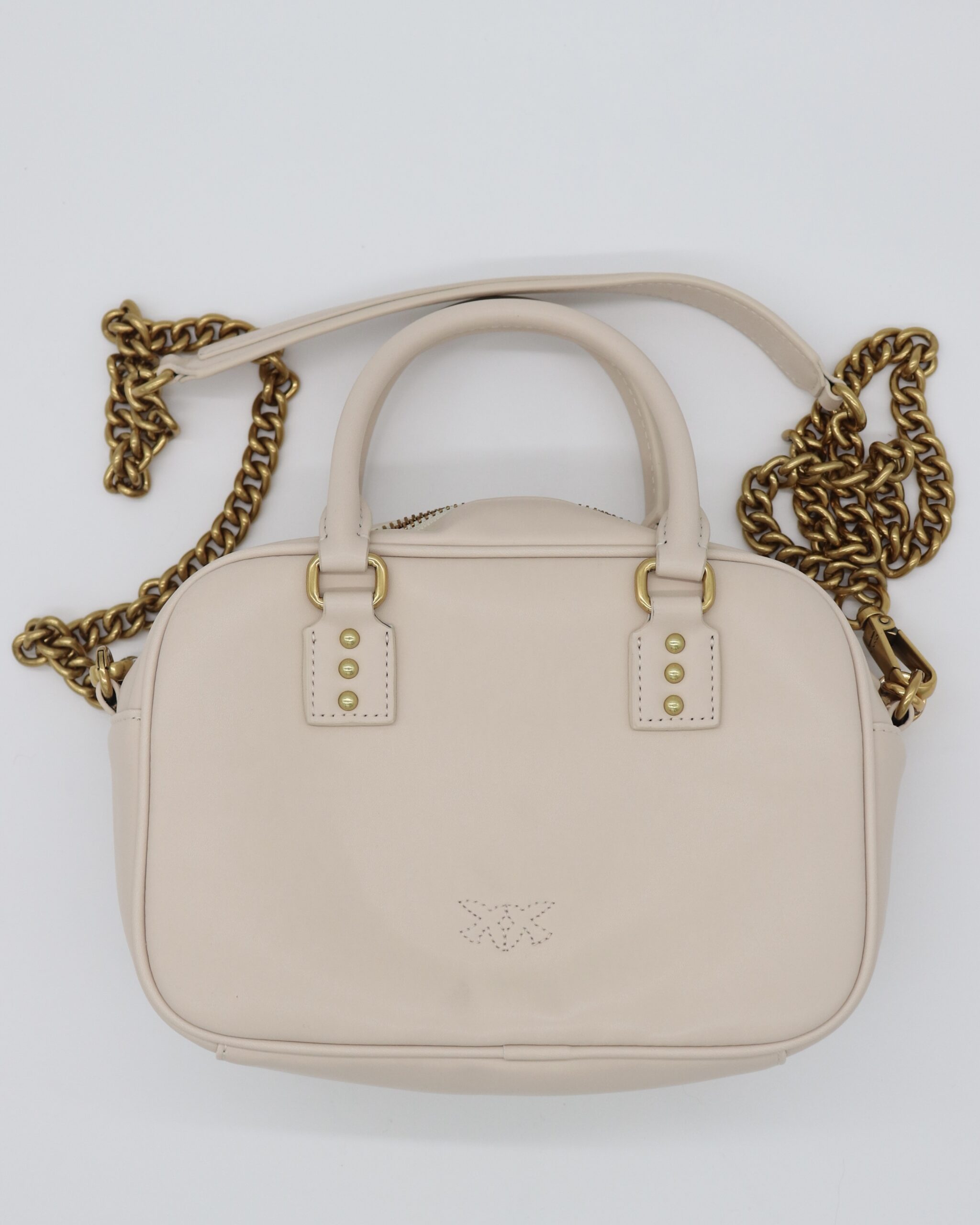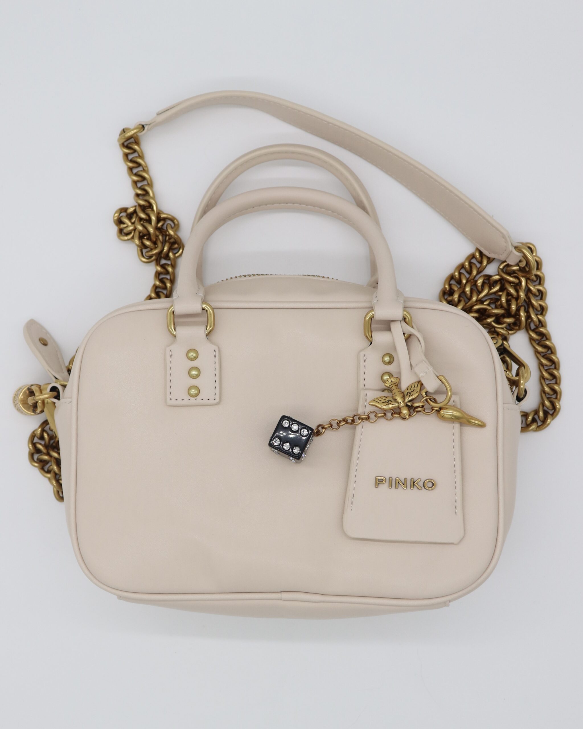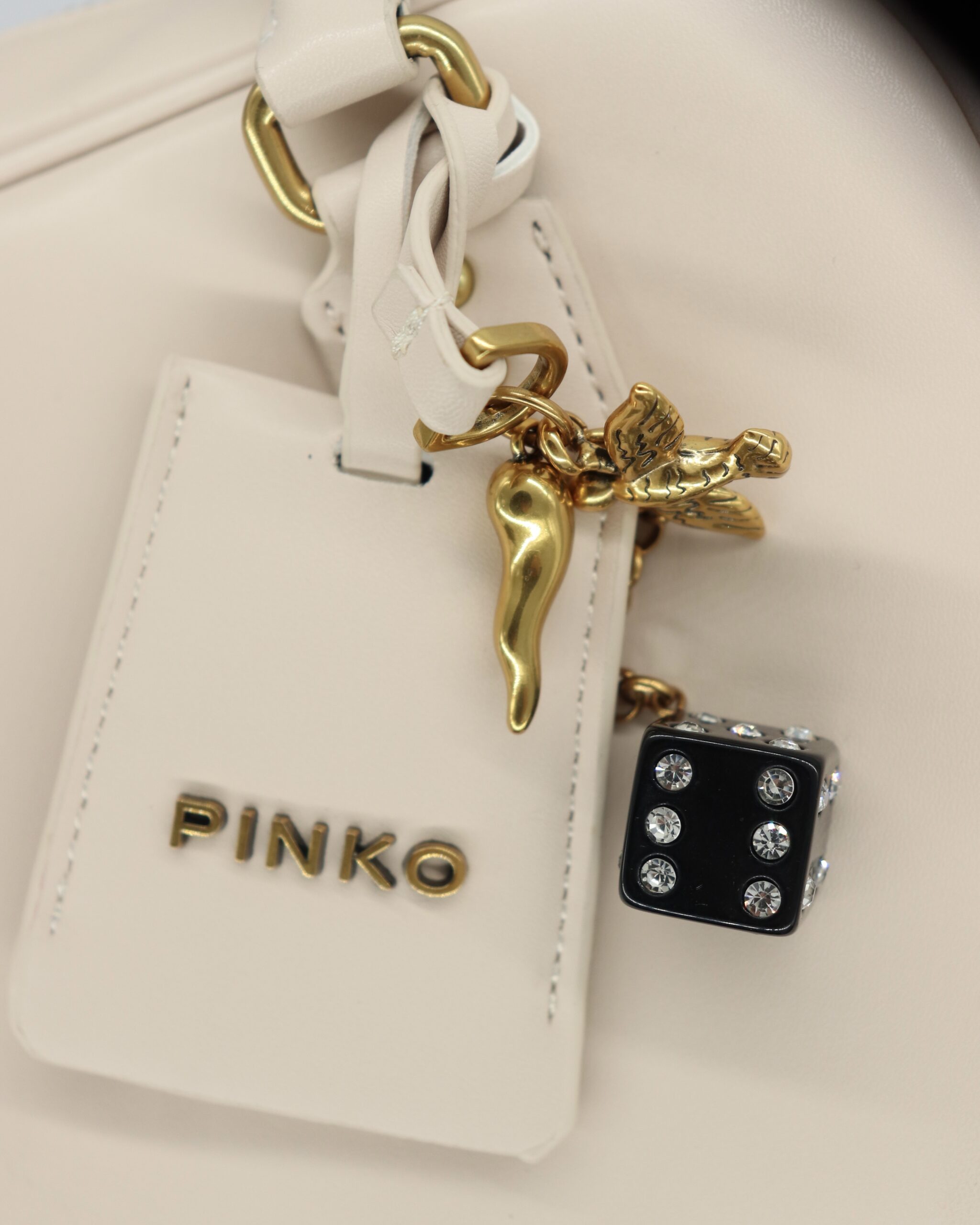 Ekskluzivna Pinko torba u nežnoj bež nijansi sa luksuznim zlatnim detaljima i specifičnim privešcima — metalna ptica, crna kockica sa kristalima i mali katanac sa rotirajućim PINKO slovima. Kompaktan box oblik i dvostruke ručke čine je odličnom za svaki dan, dok kaiš sa karabinjerima omogućava i nošenje preko ramena.