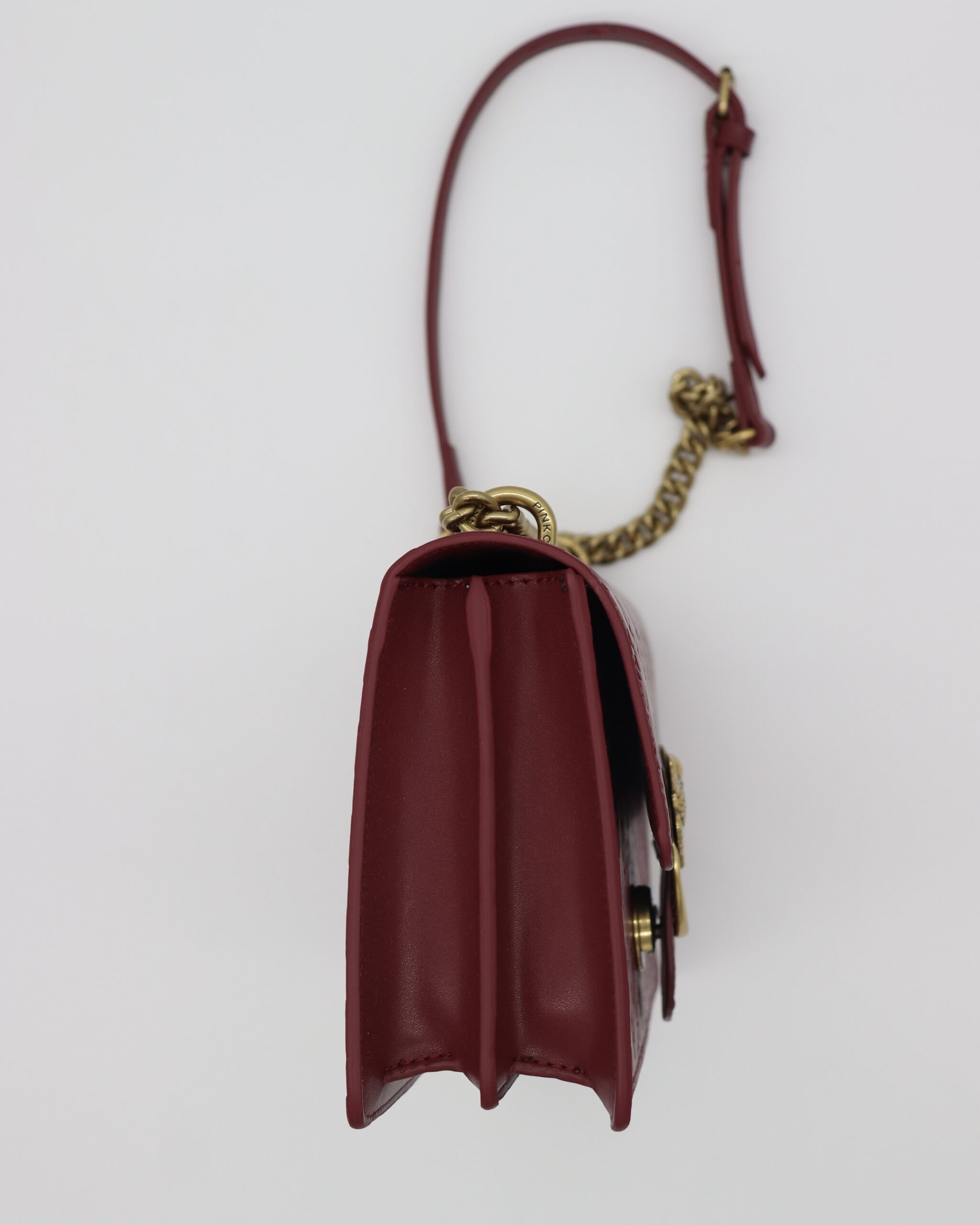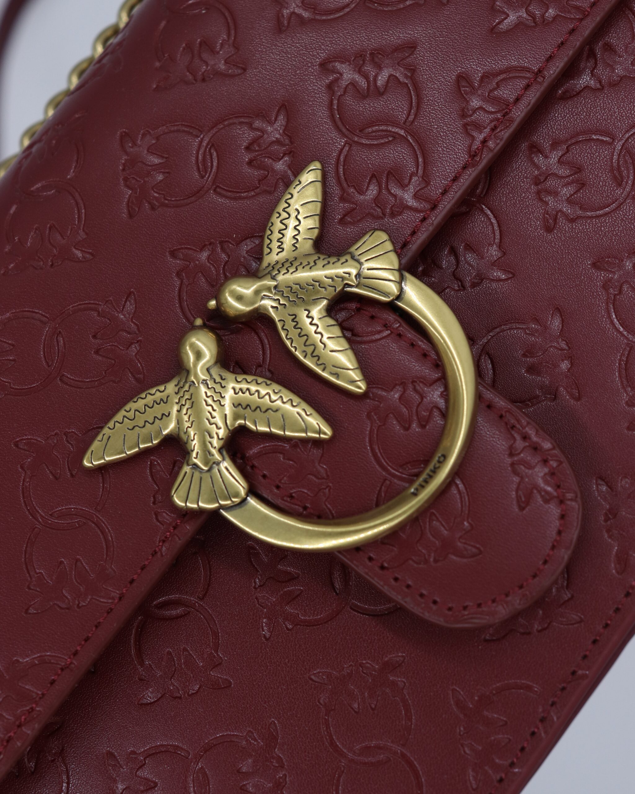 Elegantna torba od jagnjeće kože u bordo nijansi sa utisnutim Pinko logoom po celoj površini. Zatvara se čvrstom metalnom kopčom sa motivom ptica. Model je praktičan, ali istovremeno luksuzan — savršen za dnevne i večernje varijante. Kaiš kombinuje zlatni lanac i kožni deo za udobnije nošenje.