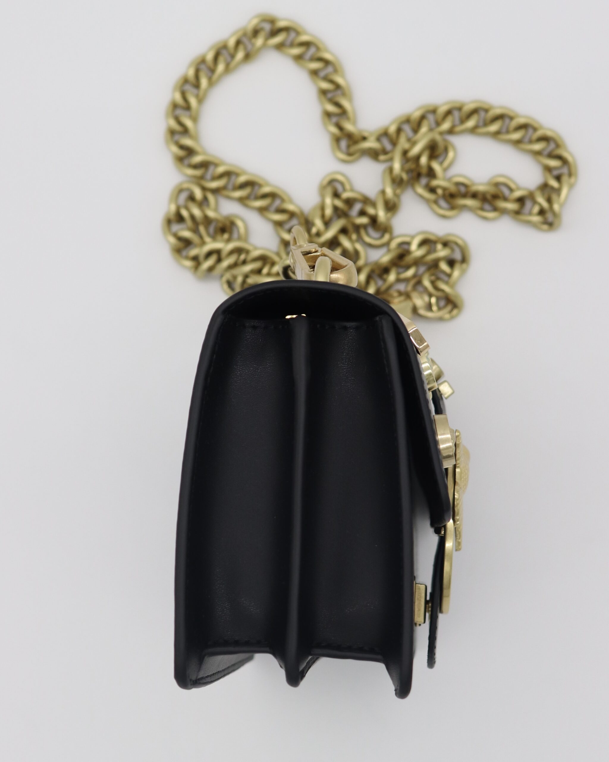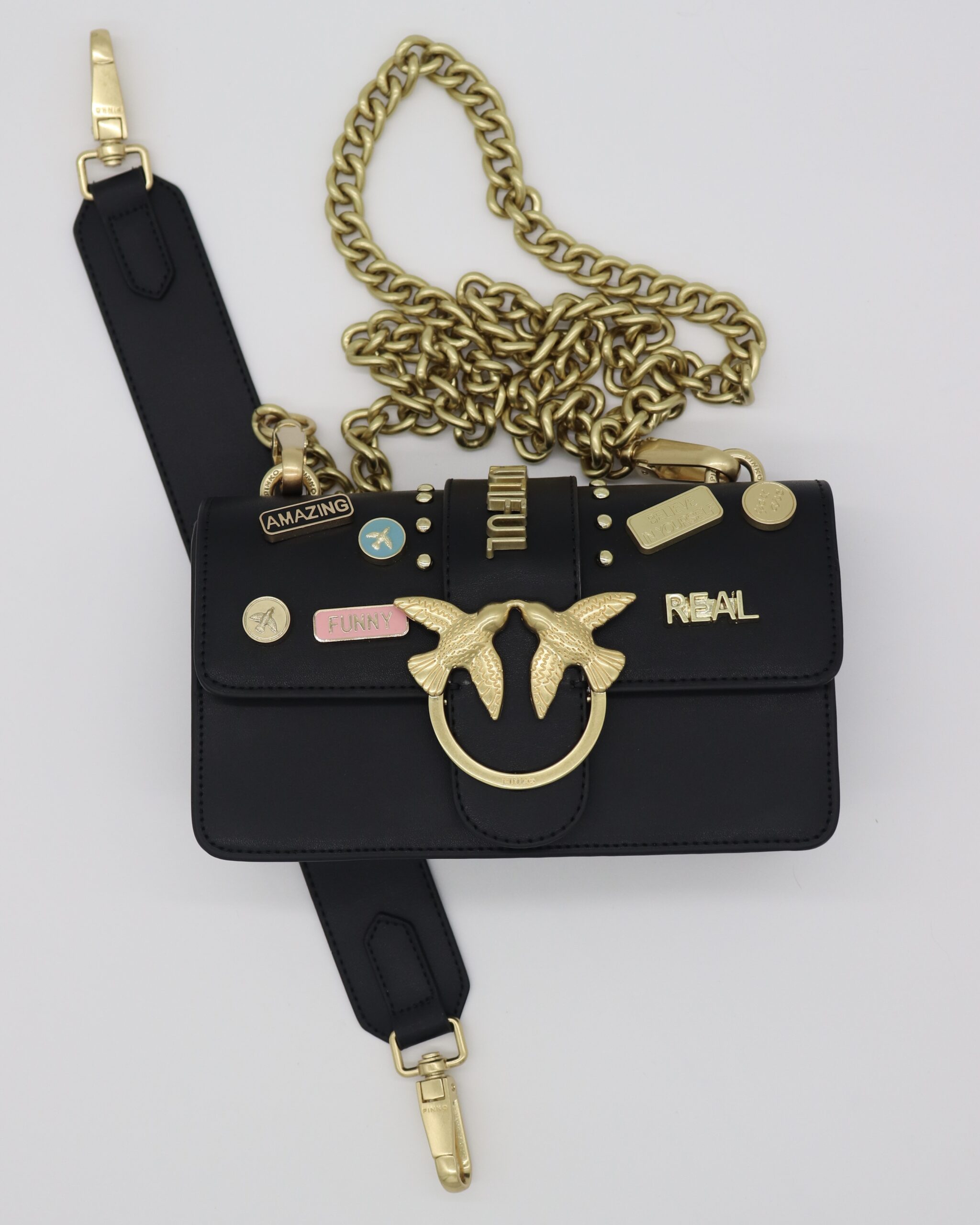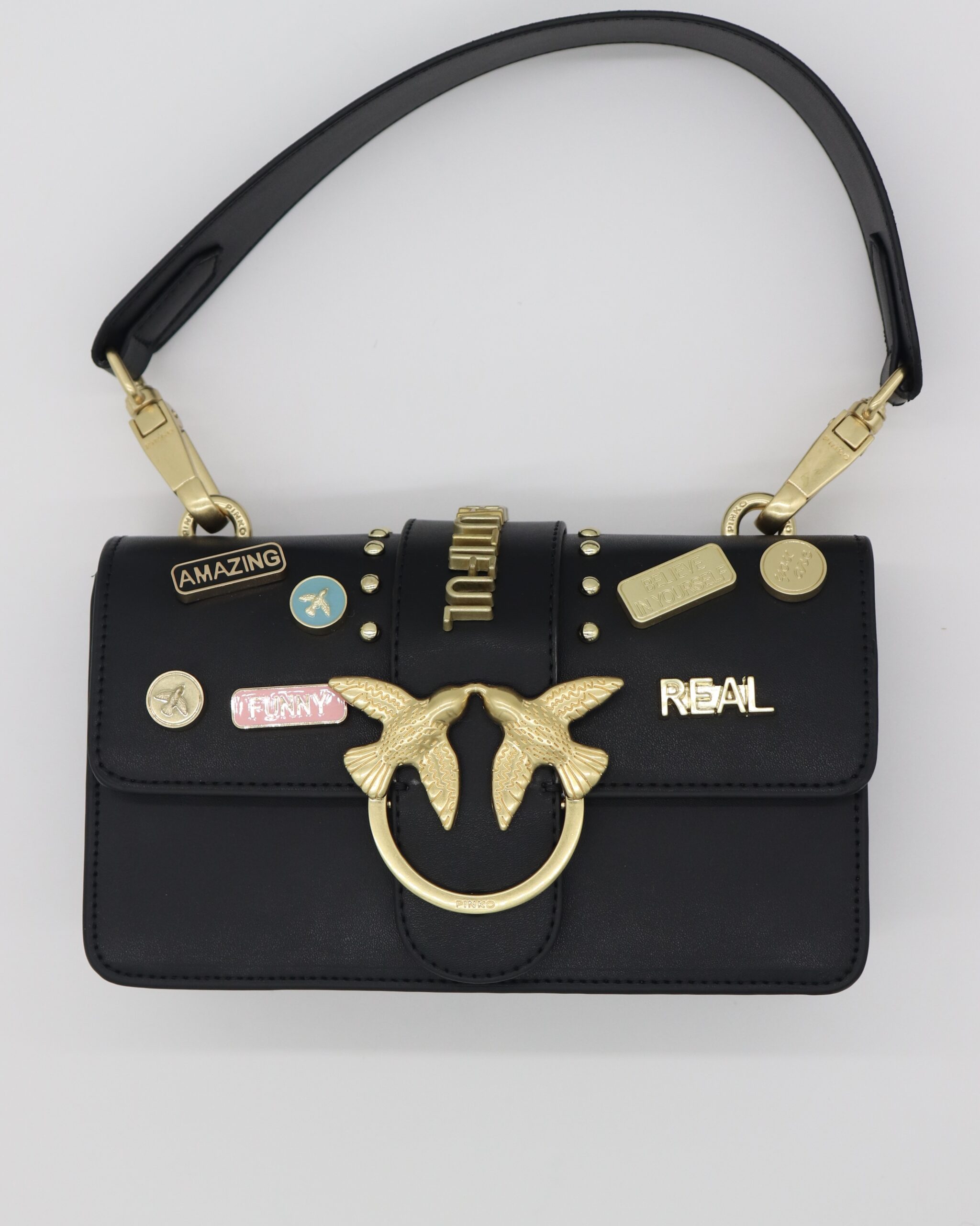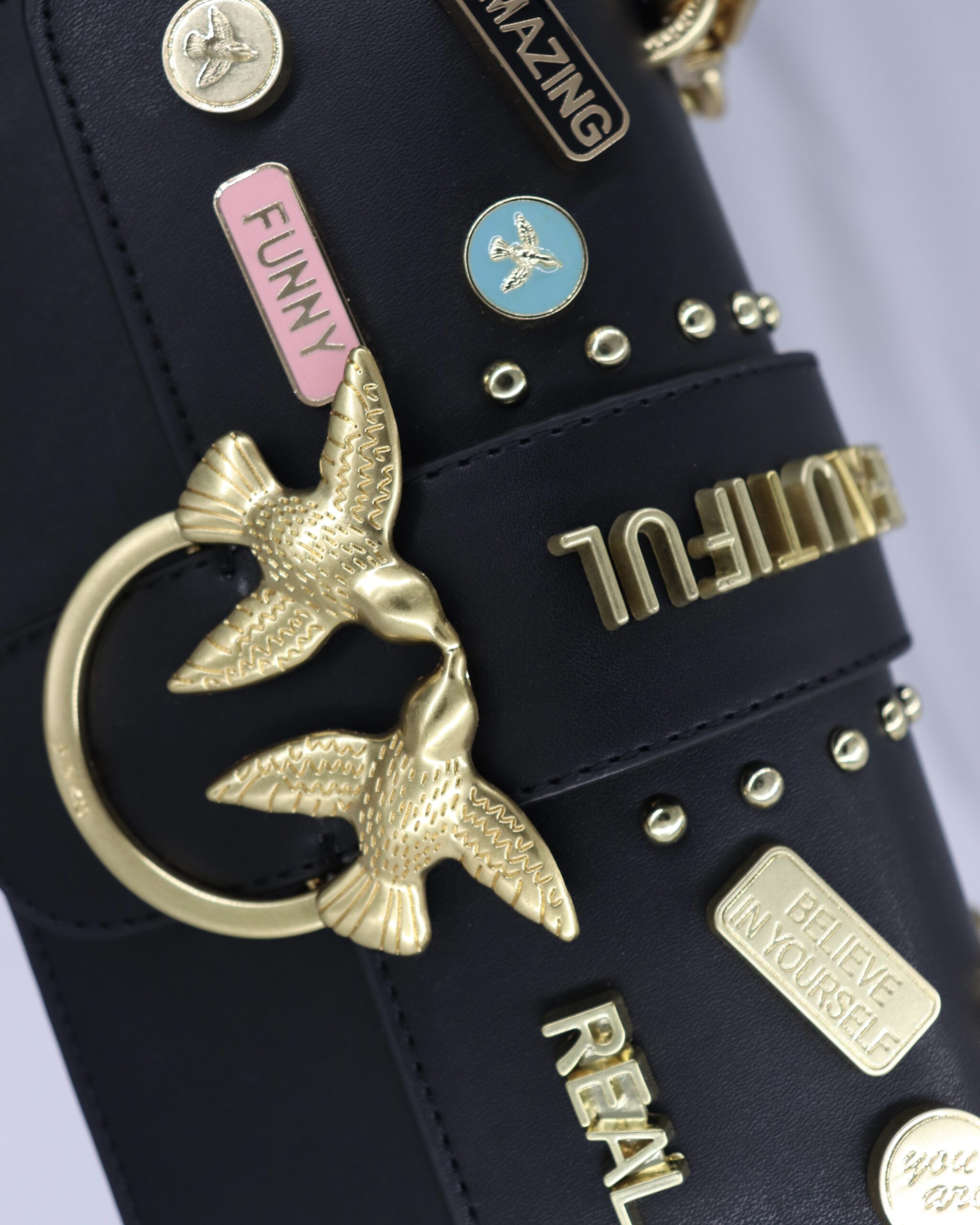Crna Mini Love torba sa zlatnim aplikacijama i rečima koje slave samopouzdanje, autentičnost i lepotu. Mekana jagnjeća koža i zlatna kopča sa pticama daju torbi luksuzan izgled, dok joj bedževi u pop-art stilu dodaju razigran karakter. Savršen izbor za one koje vole da se izraze stilom.