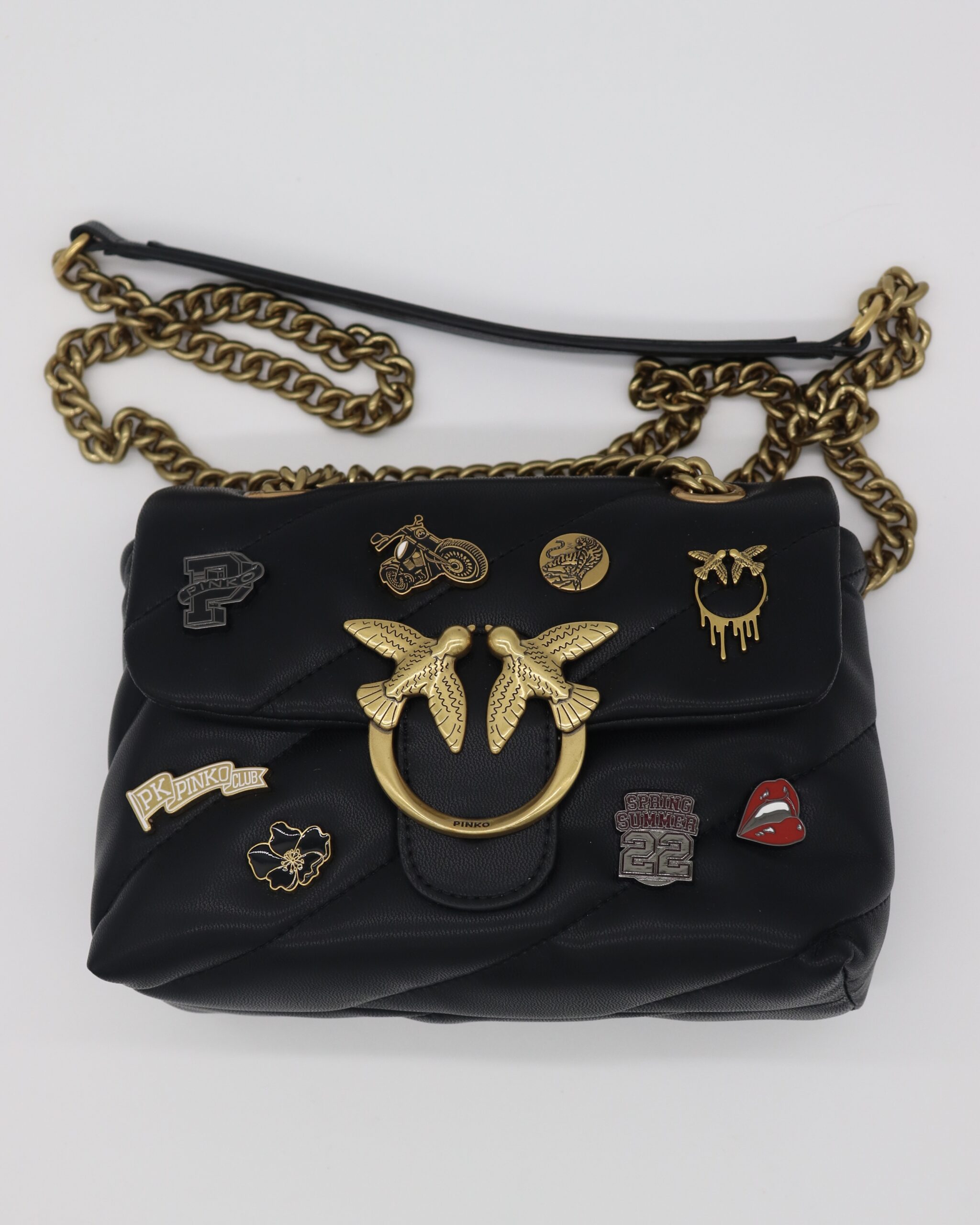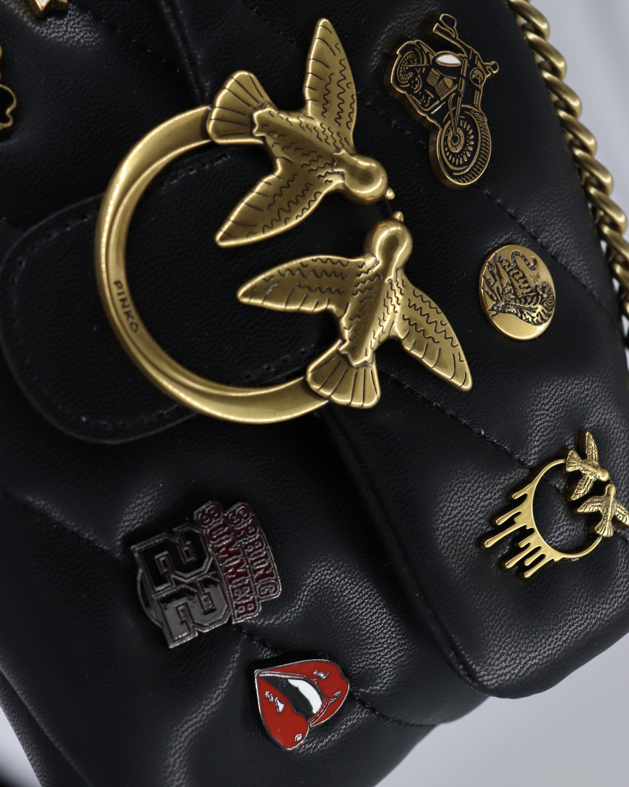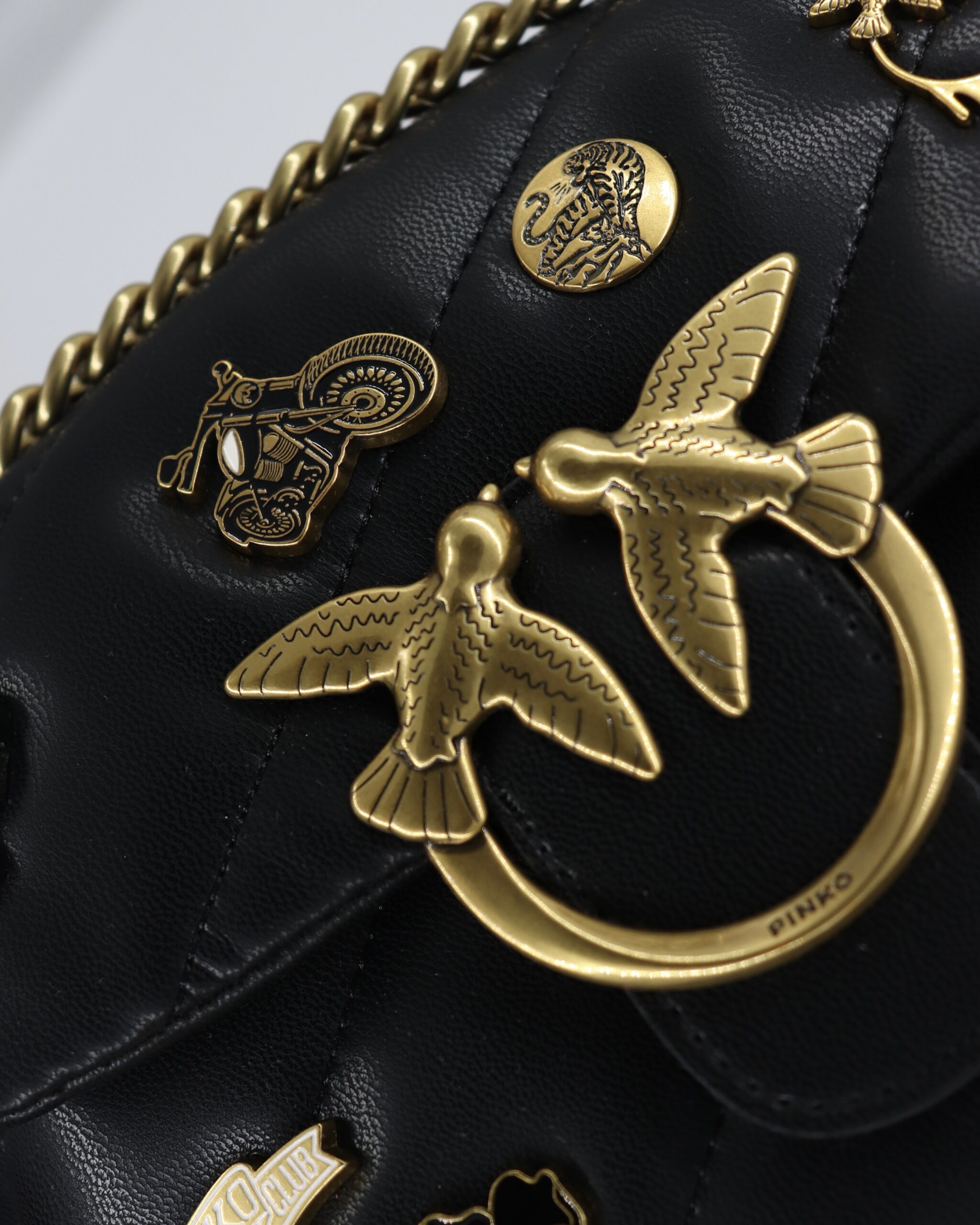 Unikatna Mini Love torba u crnoj jagnjećoj koži, ukrašena zlatnim bedževima i simbolima inspirisanim motorima, ikonama i Pinko motivima. Kombinacija mekane kože, zlatne Love Birds kopče i razigranih ukrasa čini ovu torbu savršenim modnim akcentom za urbani stil. Nosiva i danju i uveče, sa udobnim lančanim kaišem.