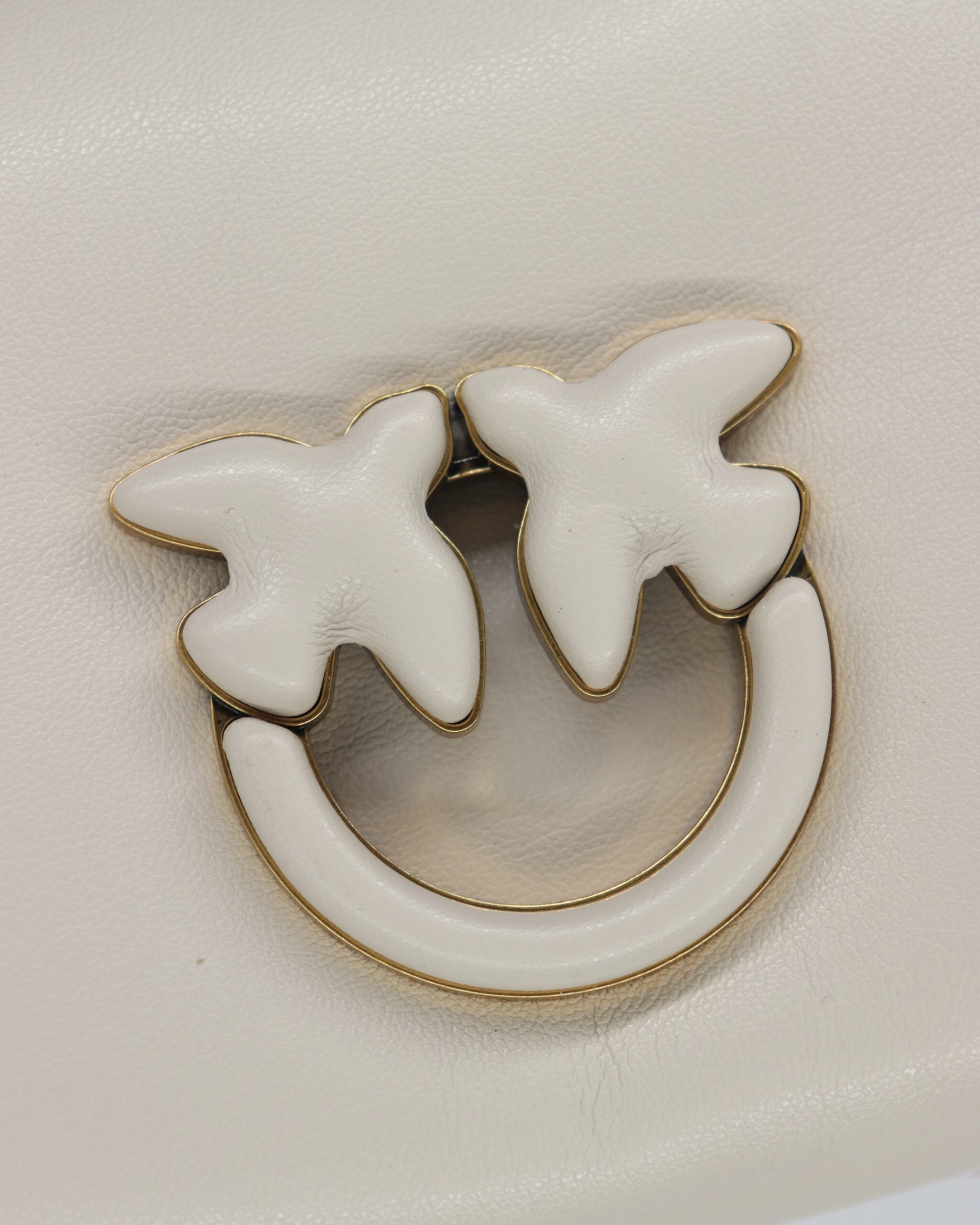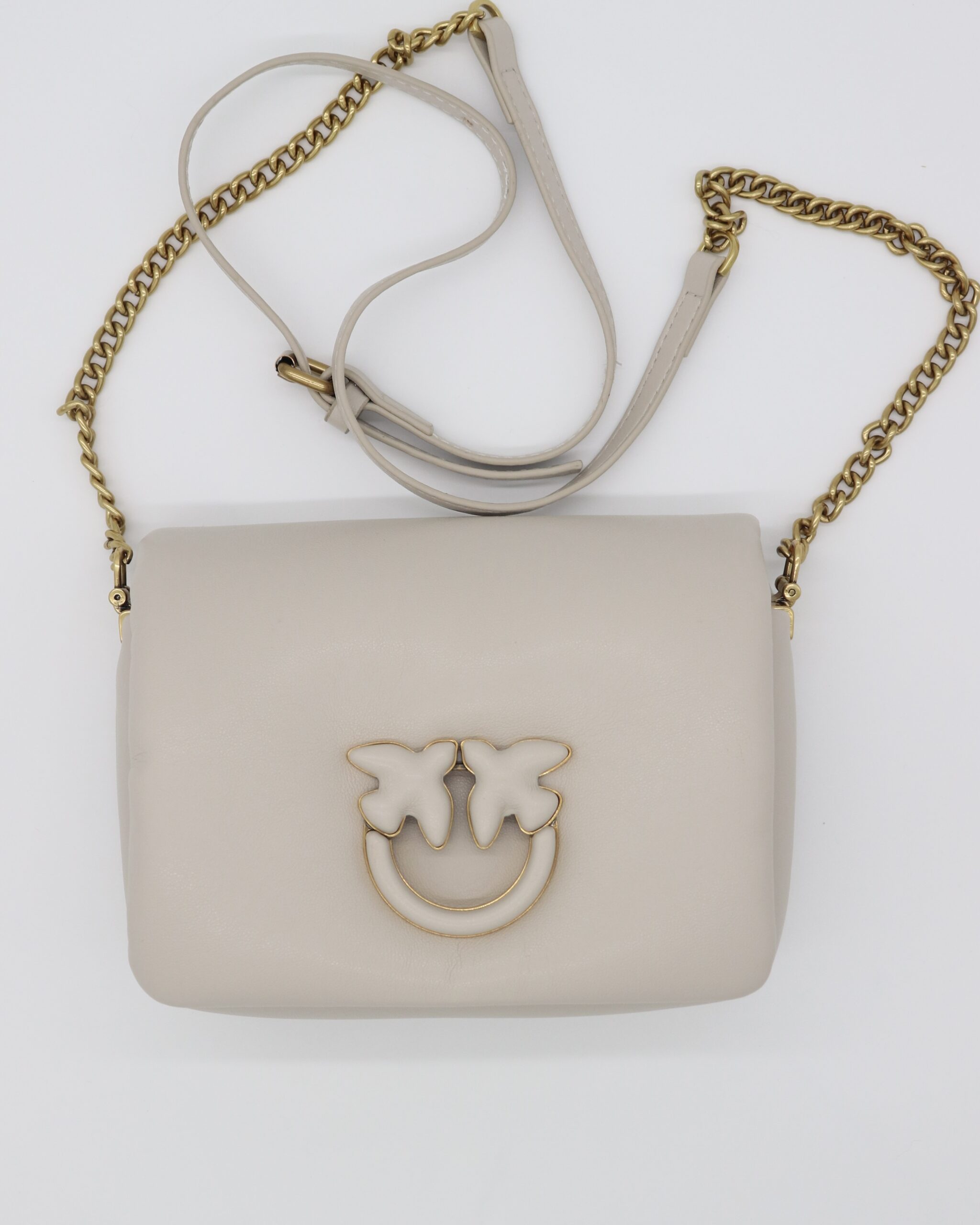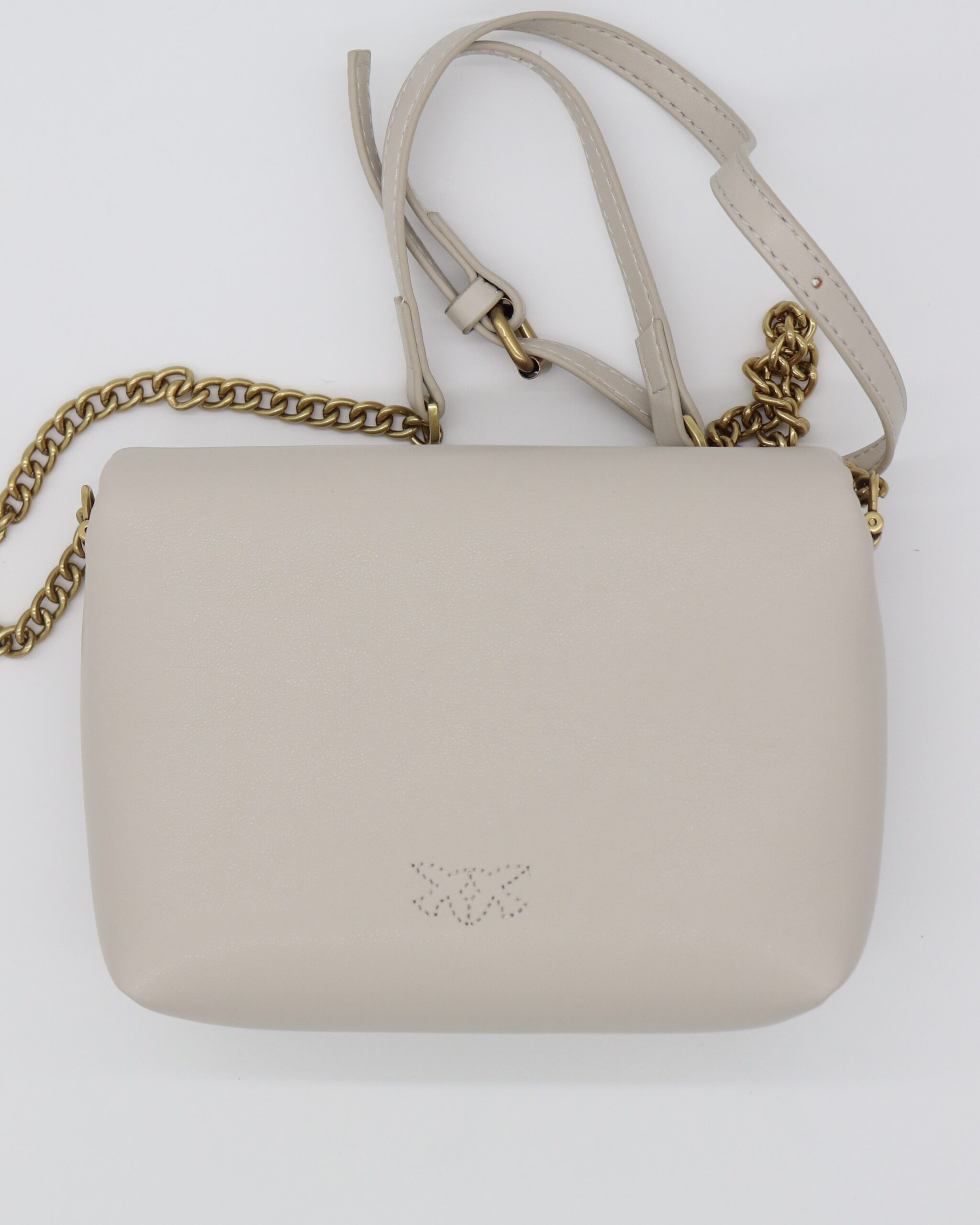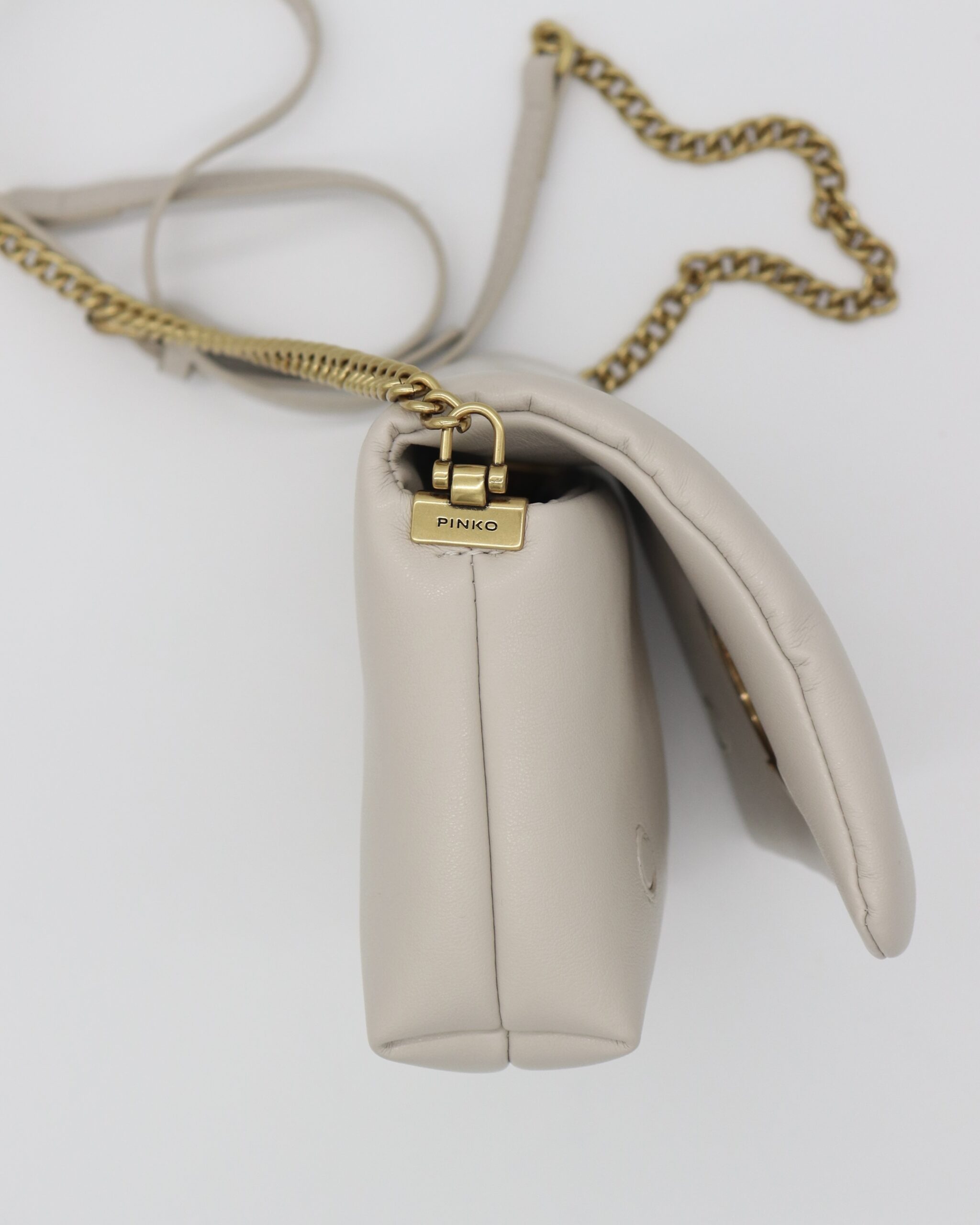 Mekana torba pastelno bež sive nijanse, izrađena od jagnjeće kože sa karakterističnom Pinko kopčom u tonu torbe. Zatvara se pomoću magnetne kopče ispod preklopa. Udobna za nošenje, lagana i dovoljno praktična za svakodnevnu upotrebu. Zlatni lanac sa kožnim kaišem omogućava nošenje na ramenu ili crossbody.
